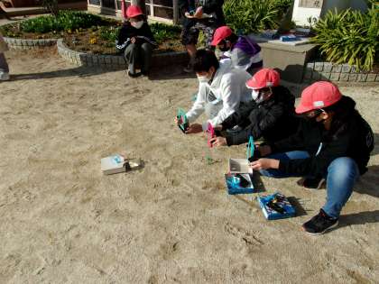 理科学習の様子です。光電池を使って実験をしています。プロペラが回りだすと、子ども達はなぜかみんな笑顔になります。とても楽しそうに実験に取り組んでいました。