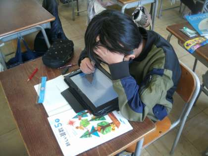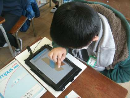算数科学習の様子です。習熟度別少人数学習で進めています。今日はタブレットを活用して台形ABCDの面積の求め方を考えています。