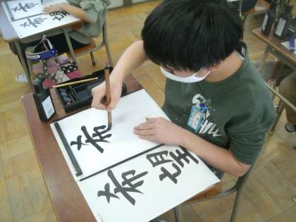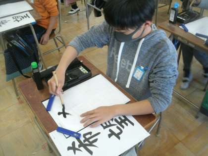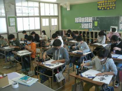 書写学習の様子です。今日は毛筆で「希望」という言葉を書きます。