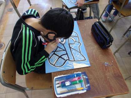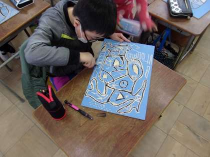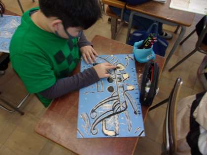 木版画に取り組んでいます。彫刻刀の使い方が上手になってきましたね。刃の前に手を持って行かないので、間違っても指を切るようなことはありません。
