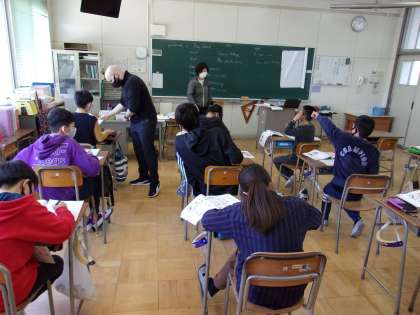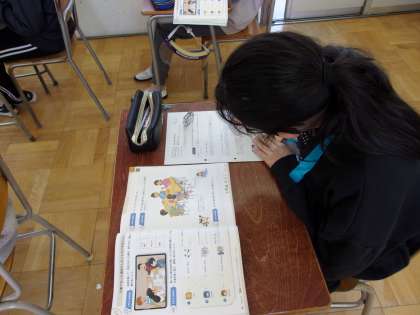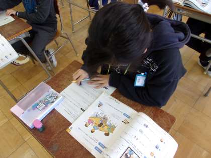 英語科学習の様子です。今日の学習は英文を書くことが多く、子ども達は苦労していました。