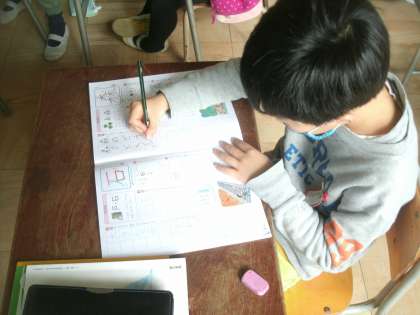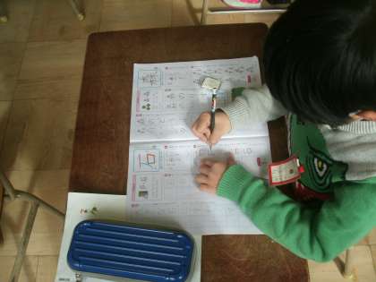 国語科学習の様子です。今日の漢字は「森」と「石」です。みんな良い姿勢ですね。