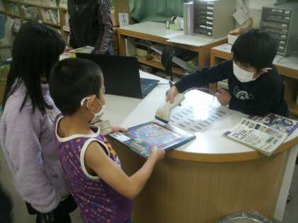 図書の本の貸し出しと返却は本に付けられたバーコードによって管理されています。2年生は図書係の子どもがバーコードを読み取る作業をしています。