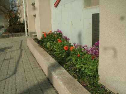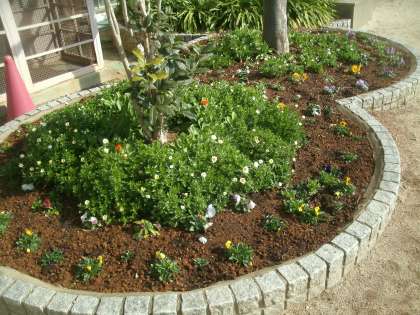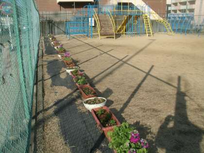 低学年に大人気のコンビネーション遊具や「金塚学習園」のある第2運動場。そこにもプランターと丸い鉢を置きました。これで金塚小学校のプランターは139個。丸い鉢は28個になりました。プランター・丸い鉢・地植えの苗の数を合わせれば2100本近くあります。バックヤードにも出番を待つ苗が300本近くあるんですよ。キンセンカ・ノースポール・サクラソウ・パンジー・ビオラなどの苗は全て管理作業員の畠山さんが種から育ててくださったものです。素晴らしいですね。金塚小学校にはキンモクセイ・サザンカ・ツバキ・サクラ・クチナシ・モクレン・白梅・紅梅などきれいな花の咲く樹木もあります。ザクロ・きんかん・温州ミカン・夏ミカン・カリン・カキなど実のなる木もあります。子ども達の感性と優しい心を育むためにこれからも「花いっぱいの学校」を目指して取り組んでいきたいと思っています。