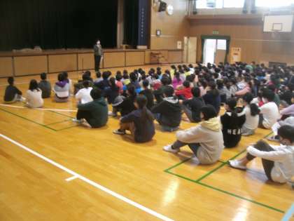 月曜日は児童朝会の日です。朝からあいにくの雨模様で、運動場が使えません。こんな日は体育館で児童朝会を実施することになっています。児童朝会では朝のあいさつの後、私が子ども達にお話する時間を頂いています。1分間で終わることを意識してお話するのですが、体育館で実施する児童朝会では子ども達を座らせて、30秒だけ長めのお話をすることにしています。
