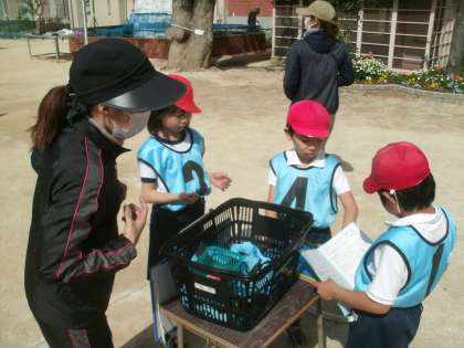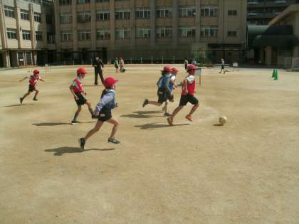 絶好の体育日和ですね。子ども達は顔を真っ赤にしてボールを追いかけていました。