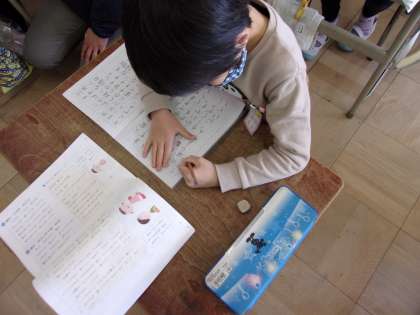学習の様子 2年生 公開日 2021/03/03 更新日 2021/03/03 お知らせ 国語科学習の様子です。今日は「すきな場しょを教えよう」の学習に取り組んでいます。一人一人がお友だちの前で自分の好きな場所についてお話をするそうです。お友だちに好きなわけもしっかり伝わるようにノートにまとめています。みんな丁寧に字を書いています。ノートは学習の基本です。保護者の皆さんも時々、お子さんのノートを見て、誉めてあげてくださいね。 いいね(0)