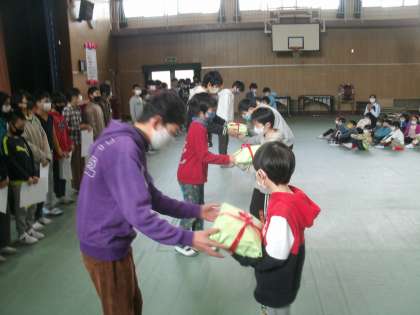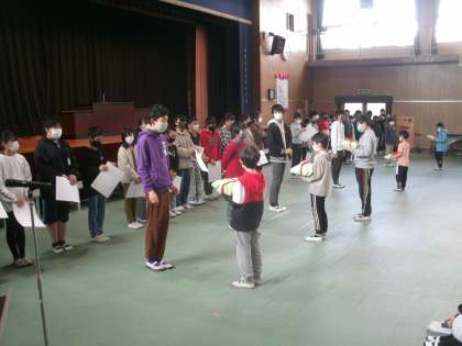 6年生から手縫いの雑巾が各学年の代表に渡されました。