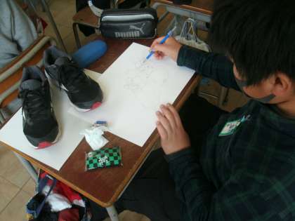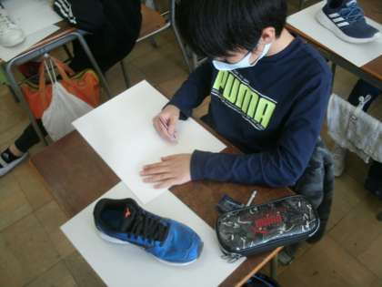 図画工作科学習の様子です。今日は自分の靴のデッサンです。細かいところまでよく見て描いていますね。