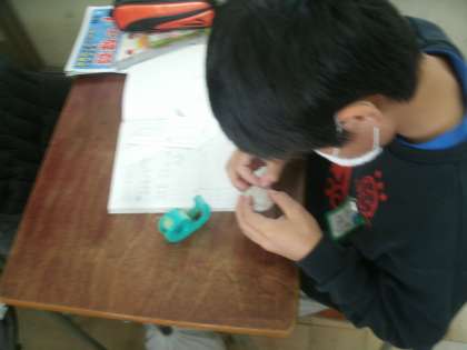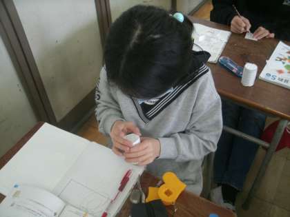 算数科学習の様子です。円柱の展開図を書いて、実際に円柱を作っています。