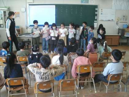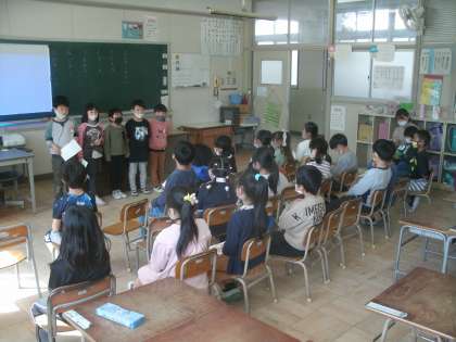 1年生の「お楽しみ会」の様子です。高学年のように自分たちの力だけではなかなか進められないので、担任の尾崎先生は大変です。私は高学年の担任を任されていたので、1年生の担任をしたことがありません。低学年の先生方がこうして粘り強く、丁寧に子ども達を指導し成長させて頂いていることで、私が高学年の担任としていられたんだとあらためて感謝しました。