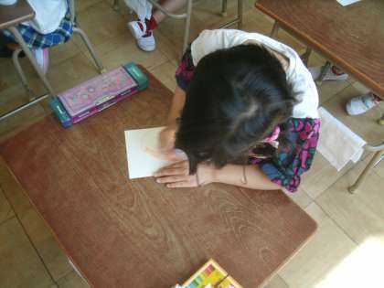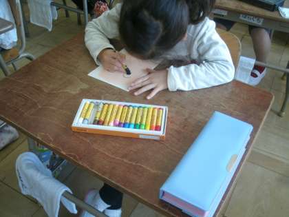 自分の顔を描いています。玄関の掲示板に掲示されるそうです。