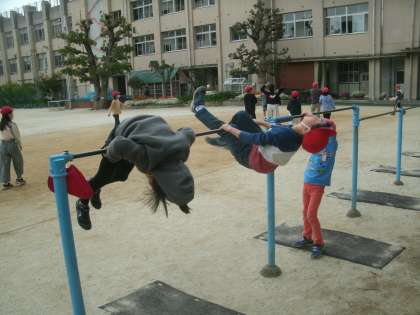 たくさんの子ども達が運動場で遊んでいます。鉄棒名人もいますよ。