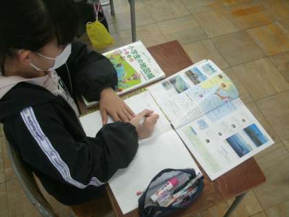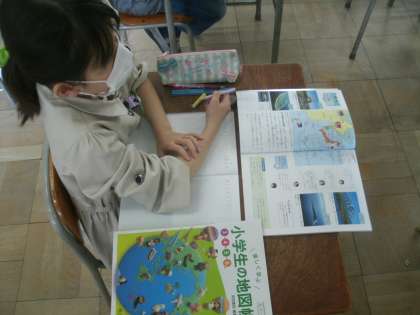 社会科学習の様子です。日本の国土について学びます。教科書やデジタル教科書、地図帳、地球儀などをフル活用して授業が進められていきます。
