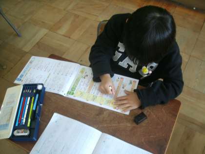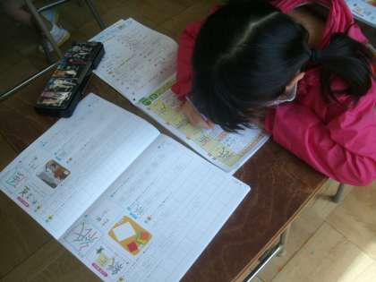 国語科学習の様子です。漢字ドリルを使って漢字学習に取り組んでいます。今日の漢字は「風」と「紙」です。2年生の新出漢字は160字です。