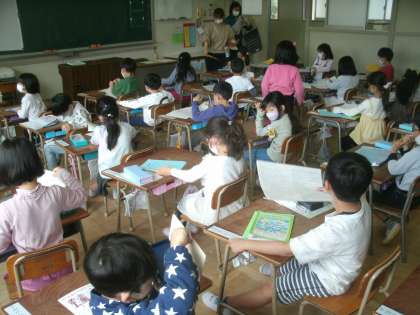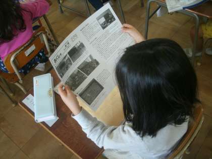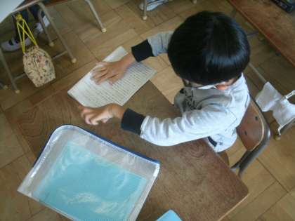 1年生にとって配られたプリントを2つに折るのも学習の一つです。もちろん連絡袋に丁寧に入れることも学習ですね。