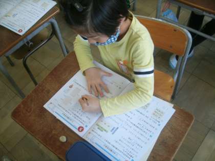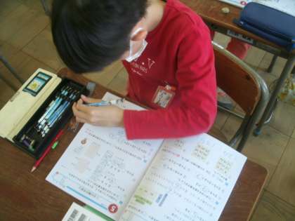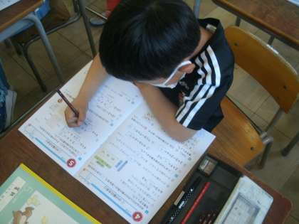 算数科学習の様子です。「かけ算のきまり」の練習問題に取り組んでいます。