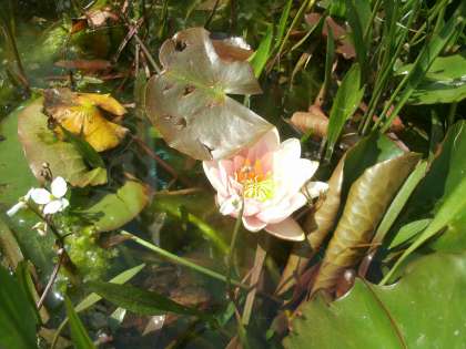 メダカ池のスイレンが咲きました。メダカ池の横にはきれいな紫色のアヤメも咲いているんですよ。