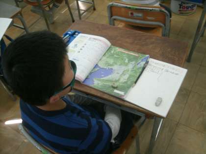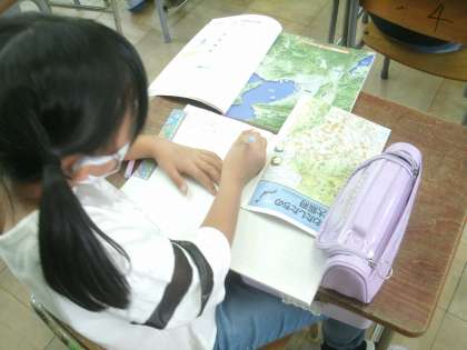社会科学習の様子です。今日の学習課題は「大阪府の位置と形を調べよう」です。