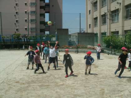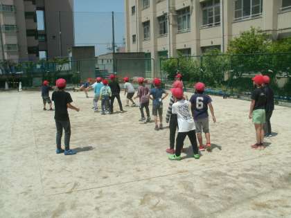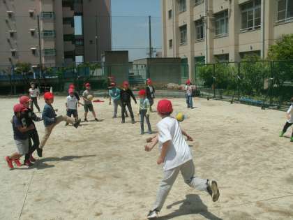 休み時間に2・3・4年生が一緒にドッジボールで楽しんでいました。異学年で一緒に楽しく遊ぶことができるのも金塚小学校の良さだと思っています。