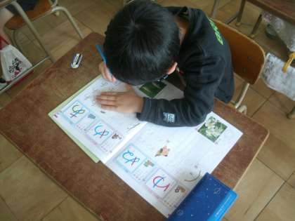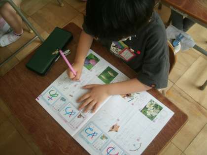 国語科学習の様子です。今日のひらがなは「あ」と「め」です。