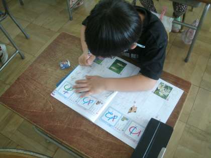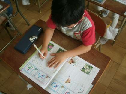 国語科学習の様子です。今日のひらがなは「あ」と「め」です。