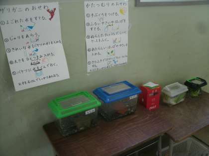 教室の前の廊下に2年生の子ども達が飼育している「ザリガニ」と「カタツムリ」がいます。