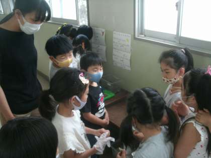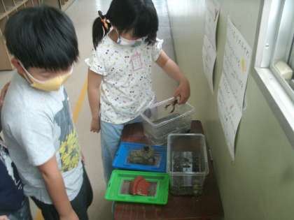 飼育係以外の子ども達も興味津々です。ザリガニもカタツムリも子ども達との強制的なふれあいの中で少し疲れているように見えるのは気のせいでしょうか。おしゃべりできるザリガニやカタツムリがいたらどんなことを言うでしょう?