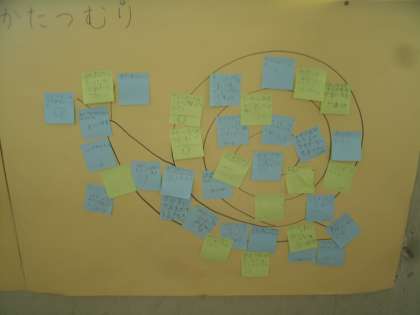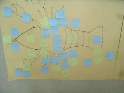 カタツムリとザリガニを観察して気の付いたことを付箋に書いて、たくさん貼り付けてありました。これだけしっかり観察してくれたら、カタツムリもザリガニも少々の触れ合い活動は辛抱してくれると思いますね。