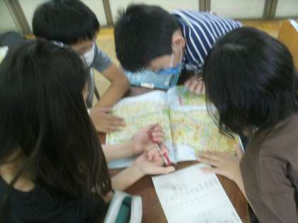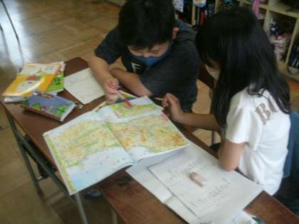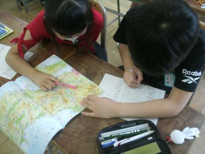 地図帳とにらめっこして、出題された地名を探しています。みんな、夢中です。
