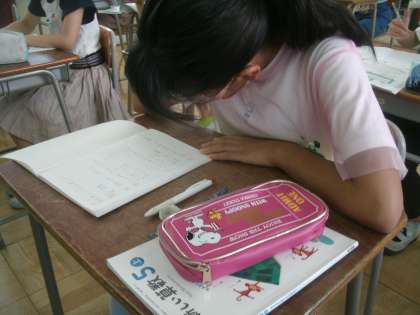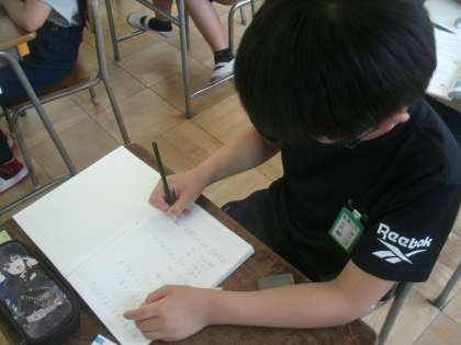 算数科学習の様子です。今日は「計算のしかたを考えよう」です。高学年になるとノートに書く量もずいぶん多くなります。ノートは学習の基本です。金塚小学校では「見える学力」を向上させる一つの方策として「学びの基本(ノート作り)」を子ども達に提示しています。