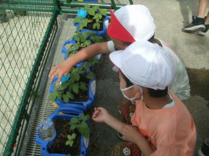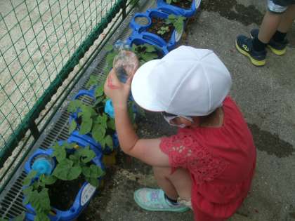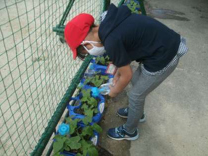いい天気が続いているので、アサガオにお水をあげましょう。