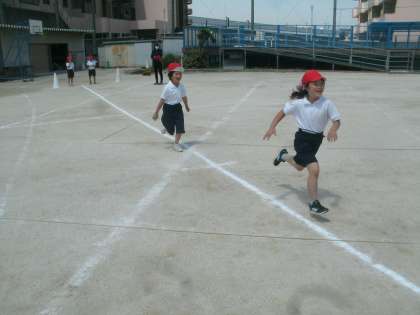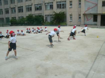 体育科学習の様子です。今日はスポーツテストに向けて、ボールを投げること、そしてまっすぐ50mを走ることの練習をしました。