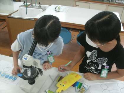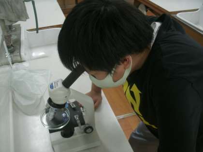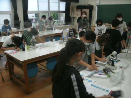 理科学習の様子です。理科室でメダカの卵を顕微鏡で観察しています。