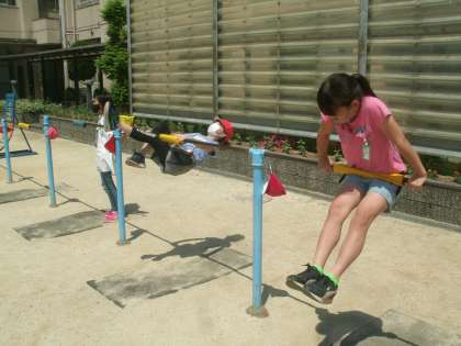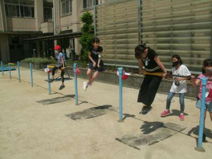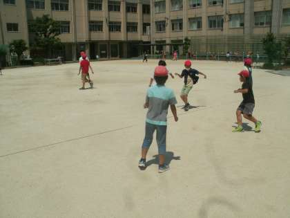 強い日差しの中、たくさんの子ども達が運動場で遊んでいます。