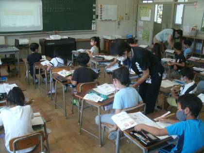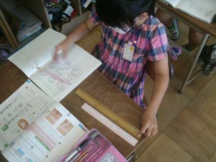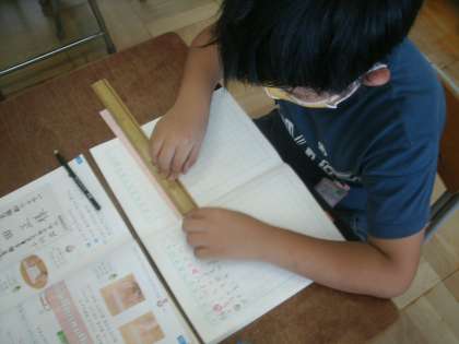 算数科学習の様子です。今日は竹のものさしを使っていますね。