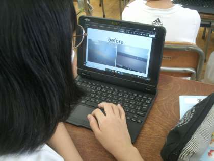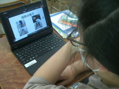 家庭科学習の様子です。グループで「クリーン大作戦」のプレゼンテーションをしています。