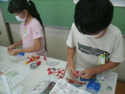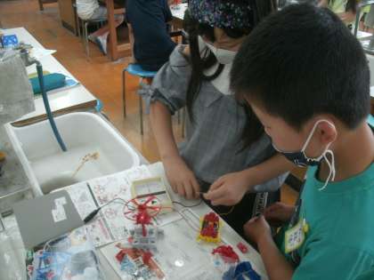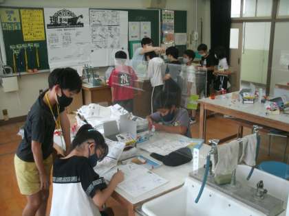 理科学習の様子です。理科室で「電気のはたらき」について実験に取り組んでいます。