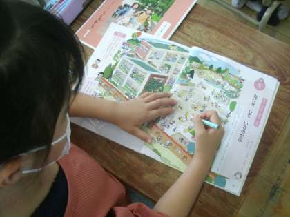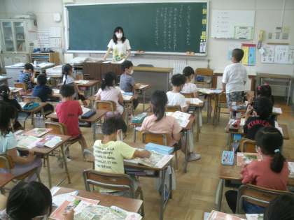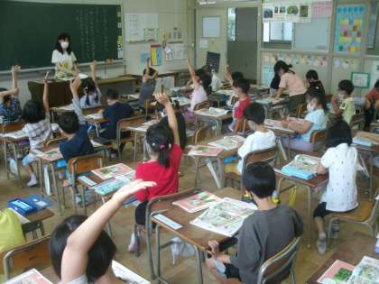 道徳科学習の様子です。「なにをしているのかな」という学習です。動物たちが暮らす街の絵を見て、子ども達が「こんなことをしたらあかんなぁ」という場面を発表しています。