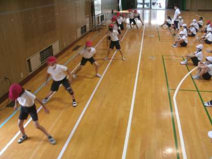 雨で運動場が使えないので、体育館で「反復横跳び」に取り組んでいました。