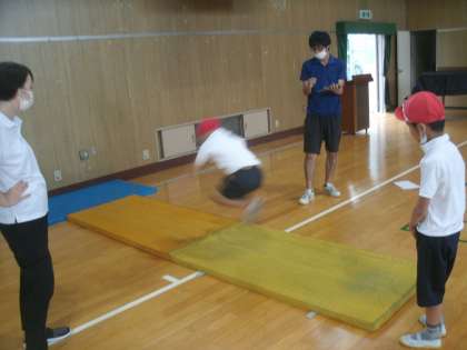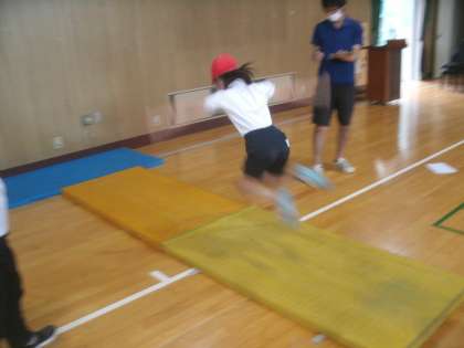 雨が降って運動場が使えないので、体育館で「立ち幅跳び」に取り組みました。