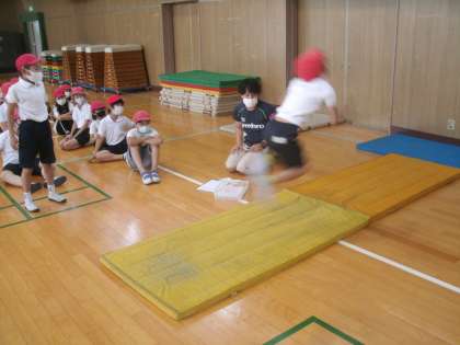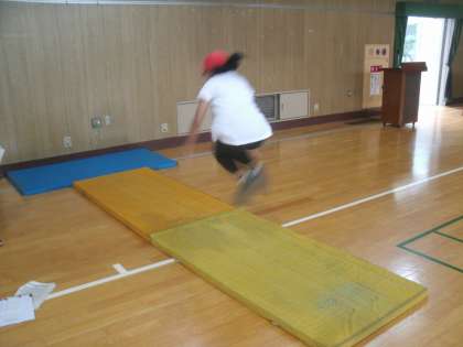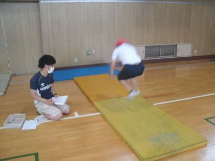 体育館で「長座体前屈」「立ち幅跳び」に取り組んでいました。