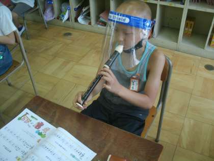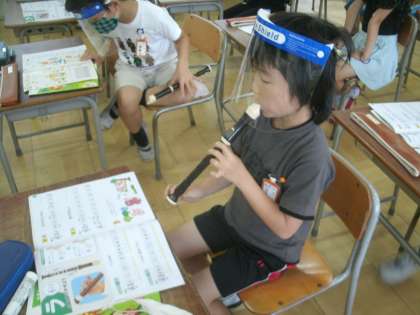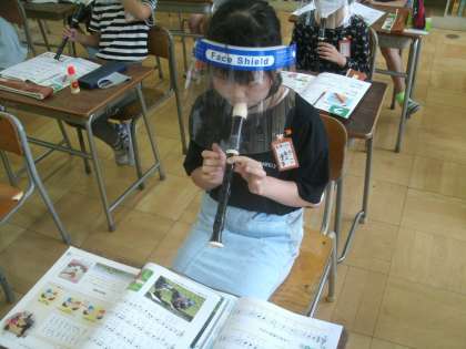 音楽科学習の様子です。ソプラノリコーダーを吹いています。
