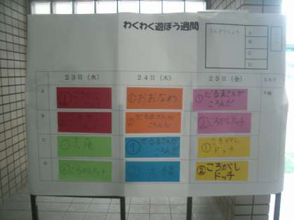 来週の水曜日から始まる「わくわく遊ぼう週間」の予定が玄関ホールに掲示されていました。