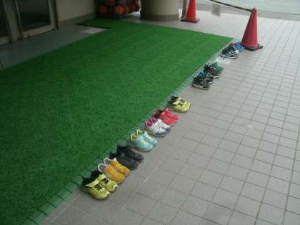 (写真)体育館で体育科学習に取り組んでいる2年生の靴です。