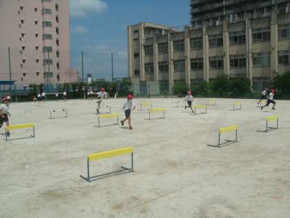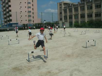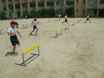 とても日差しが強くなりましたが、元気に走・跳の運動「小型ハードル走」に取り組んでいました。小型ハードルをリズミカルに走り越えるのがめあてになっています。