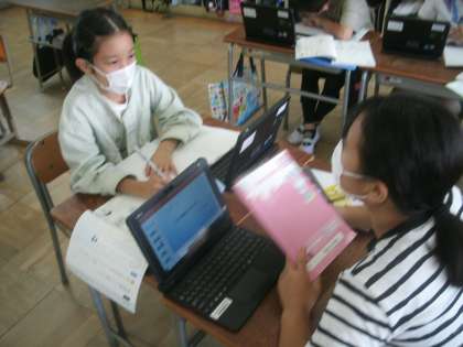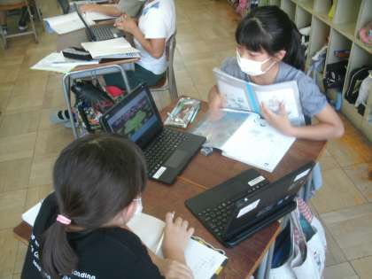 国語科学習の様子です。一人一人が「環境問題」についてまとめたレポートをお互いに批評し合います。
