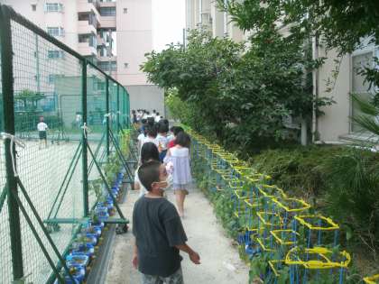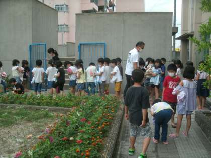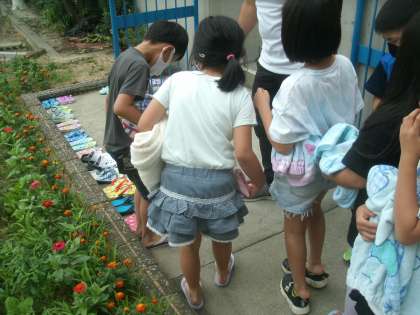 30日(水)はプール開きです。初めてのプール水泳学習に向けて、着替えや移動の仕方・並び方を練習しました。