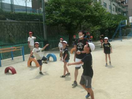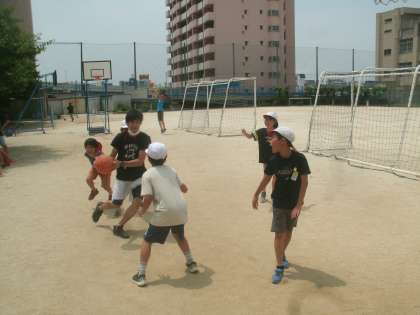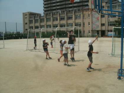 4年生が近藤先生と対戦しています。近藤先生はバスケットボールが上手なんですよ。