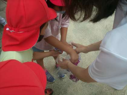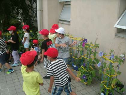 生活科学習でアサガオの花を使って「いろみずあそび」をします。たくさん咲いているアサガオの花をあつめていました。